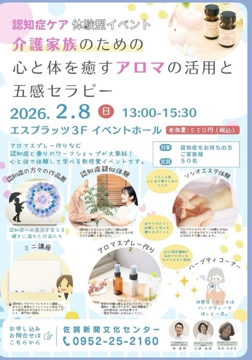 介護家族のための心と体を癒やすアロマと五感セラピー認知症ケアのイベント開催!アロマコーナーは当校卒業生のAEAJ認定アロマテラピーインストラクター松永みゆき先生が担当です。参加費500円ご参加お待ちしています。